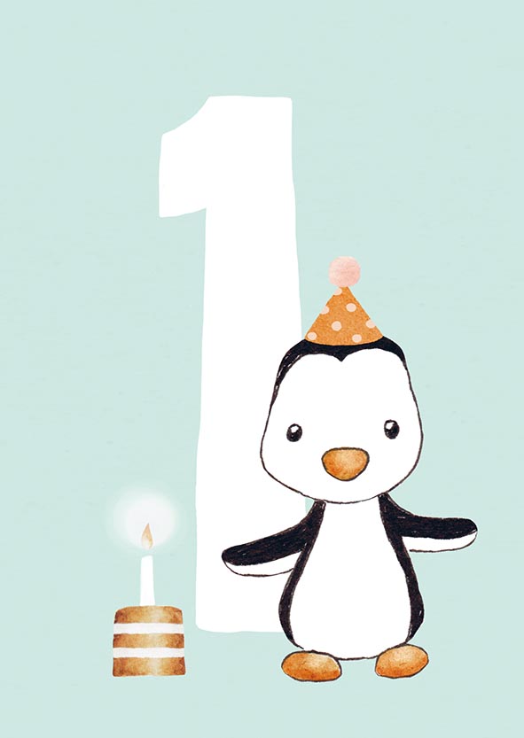 Kannessa numero 1 sekä pingviini juhlahattu päässä.