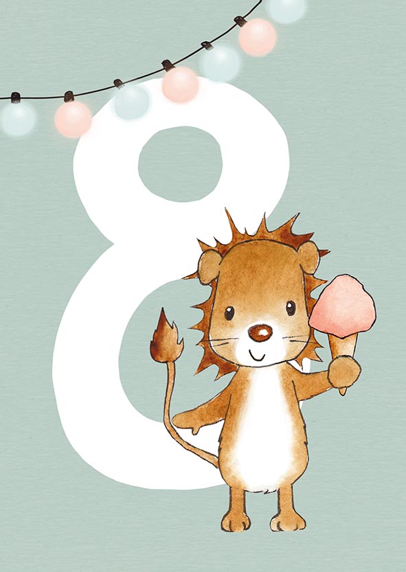 Kannessa numero 8 sekä leijona jolla jäätelötuutti kädessä.