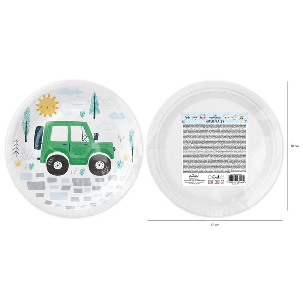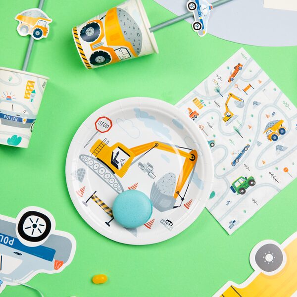 Paperilautaset suolaisille ja makeille välipaloille. Lautassetistä löytyy: jeeppi, kovakuoriainen, paloauto, poliisiauto, kippiauto ja kaivinkone
