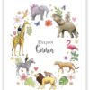 Kannessa englanninkielinen teksti ”Happy birthday”, kuvassa seitsemän dinosaurusta, jotka kantavat lahjapaketteja.
