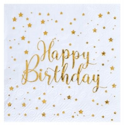 20 pientä lautasliinaa Happy Birthday -metallikokoelmasta, valkoista paperia, kultainen kirjoitus, syntymäpäiville.