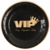 Pakkauksessa 10 kahdeksankulmaista Happy New Year lautasta, Hyvää Uutta Vuotta, kultainen pahvi, valkoinen ja musta painatus.