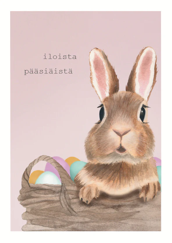 Kuvassa pääsiäispupu joka kurkistaa pääsiäismunakorista ja teksti ”Iloista pääsiäistä”.