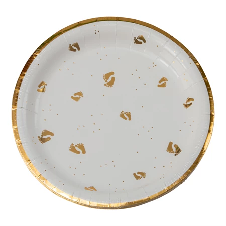 8 pahvilautasta, joissa on pieniä jalanjälkiä foliokulta, jotka sopivat täydellisesti vauvakutsuihin, kasteisiin tai nimen antamiseen. Mitat: 23 cm. Materiaali: FSC-paperi