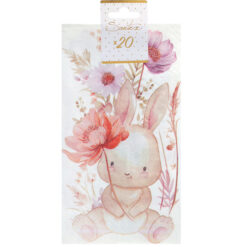 3-kerroksinen lautasliina, joka on koristeltu hellyyttävällä kaniinilla ja kukkasilla. Pakkaus sisältää 20 lautasliinaa.
