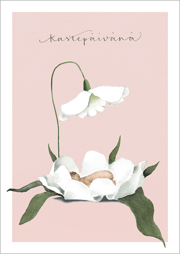 Kannessa kuva valkoisesta kukasta jonka päällä makaa vauva, vaaleanpunainen tausta sekä teksti ”Kastepäivänä”.