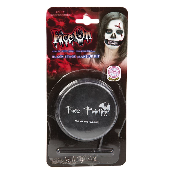 Musta öljypohjainen kasvomaali. Mukana meikkisivellin. Tässä tuotteessa käytetyt ainesosat täyttävät laatustandardit. Saattaa aiheuttaa ärsytystä herkillä ihmisillä. Peruuta, jos näin tapahtuu. Lasten tulee käyttää tätä tuotetta aikuisen valvonnassa. Älä levitä vaurioituneelle, auringonpolttaneelle, tulehtuneelle tai herkälle iholle. Poistaaksesi meikin, pyyhi paperilla tai vanupuikolla, pese saippualla ja lämpimällä vedellä.