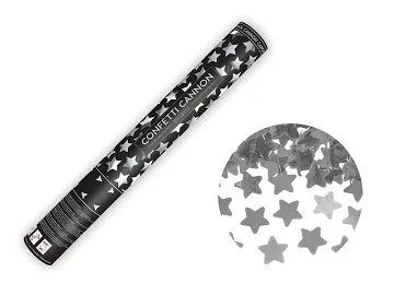 Hopeinen konfettitykki, joka ampuu näyttäviä metallinhohtoisia tähtiä. Putken pituus 40 cm – täydellinen juhlahetkien huipennukseen.