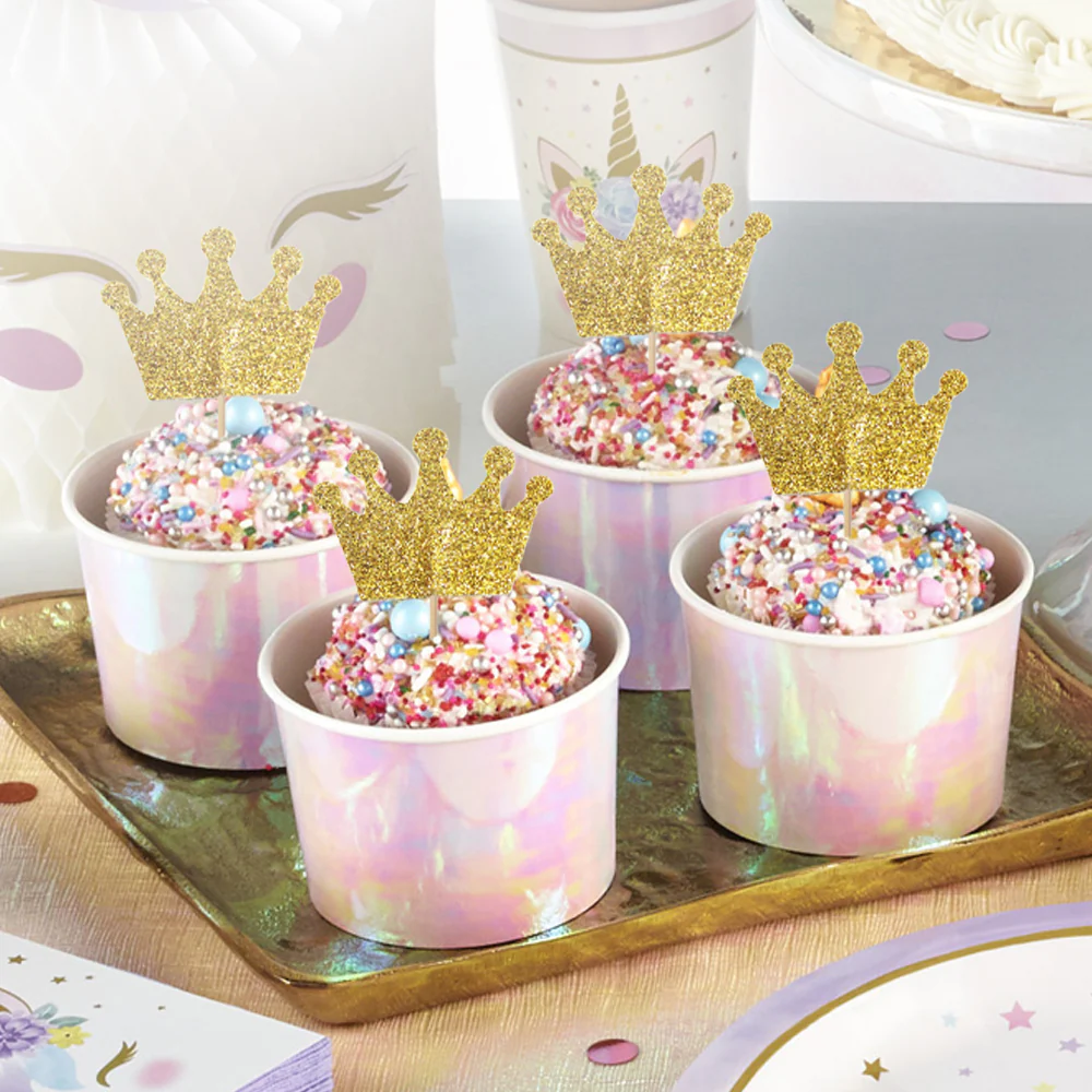 Pakkaus sisältää 12kpl, kaksipuolisia glitter-kruunuja.