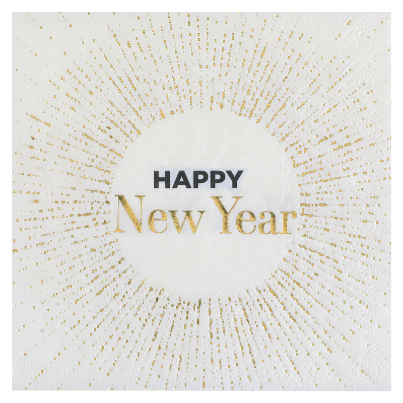 Perinteisesti uusi vuosi on juhlaa, juhlapalveluita ja eleganssia myös iltapuvussasi. Valkoiset ja kultaiset astiat ovat siksi tervetulleita. Valkoisella taustalla nämä paperilautasliinat toivottavat vieraillesi jopa ”hyvää uutta vuotta” kimaltelevan kullan värisenä. Tämä 33 x 33 cm auki oleva 10 täytteen setti seuraa sinua aperitiivista jälkiruokaan upeaan tyylikkääseen ja juhlavaan iltaan.