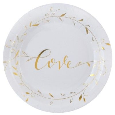 10 metallista Just Married -kokoelman paperilautasta, rakkauskuvitus.