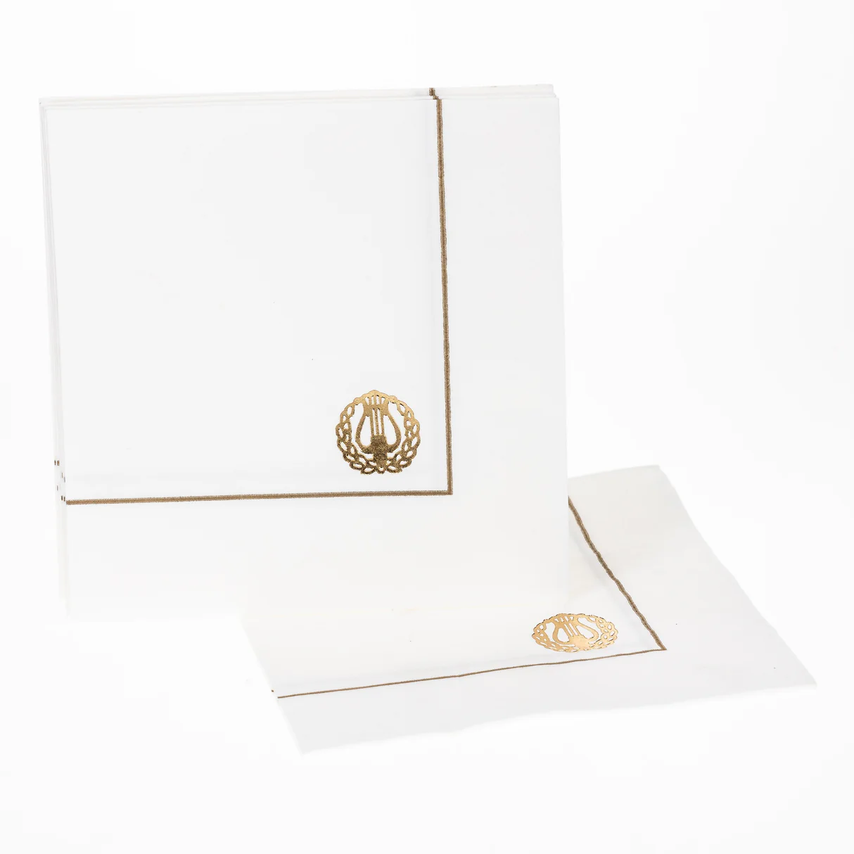Kaunis ja tyylikäs lautasliina ylioppilasjuhliin. Valkoinen lautasliina, jossa kimaltava kullanvärinen lyyra- ja reunaviiva-painatus. Koko avattuna 25×25 cm.