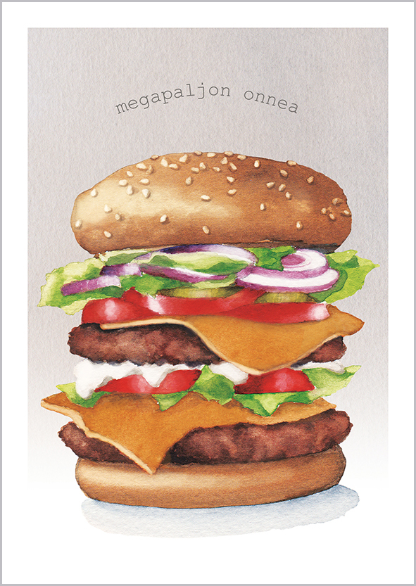 Kuvassa kerroshampurilainen, vaaleanharmaa tausta ja teksti ”megapaljon onnea”.