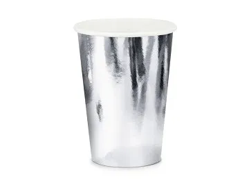 Paperikupit, hopeaa, tilavuus jopa 220 ml (7,4 oz). Juomakupeissa on 17 päivänä joulukuuta 2020 annetussa komission täytäntöönpanoasetuksessa (EU) 2020/2151 säännöistä direktiivin (EU) 2019/904 liitteessä olevassa D osassa lueteltujen kertakäyttöisten muovituotteiden yhdenmukaistettuja merkintäeritelmiä koskevista säännöistä vaadittu painettu merkintä. Euroopan parlamentti ja neuvosto tiettyjen muovituotteiden ympäristövaikutusten vähentämisestä