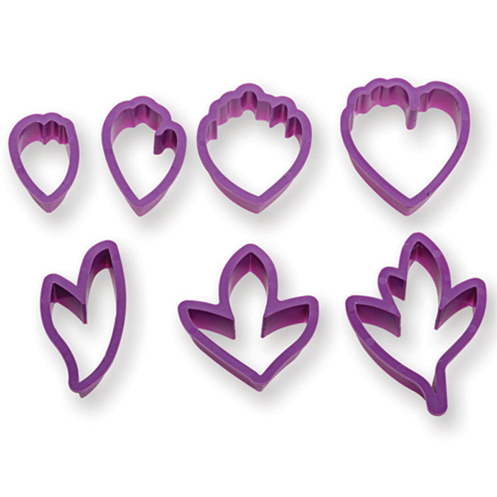 Seitsemän muovileikkurin sarja, jolla voit tehdä upean pionin lehtien kanssa. Koostuu 4 leikkurista silmulle ja 3 leikkurista terälehdelle.