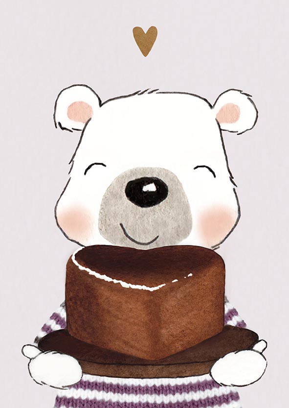 Kuvassa hymyilevä nalle joka pitää käsissään kakkua, nallen yläpuolella pieni sydän, beige tausta.