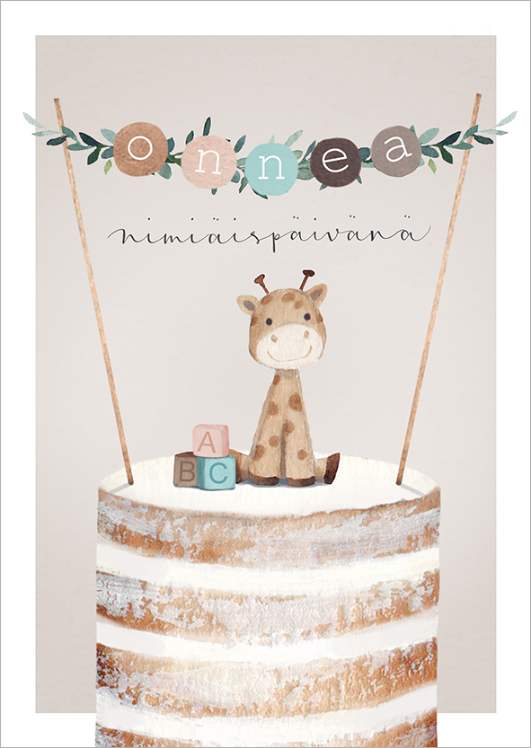 Kotimainen 2-osainen kortti laadukasta kartonkia. Kannessa kuva kerroskakusta jonka päällä kirahvi. Kortissa tekstit ”Onnea” sekä ”Nimiäispäivänä”. Kortti on sisältä tyhjä ja sisältää kirjekuoren.
