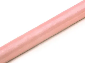 Sileä roosan sävyinen organza-kangas juhlakoristeluun. Leveys 36 cm, pituus 9 m