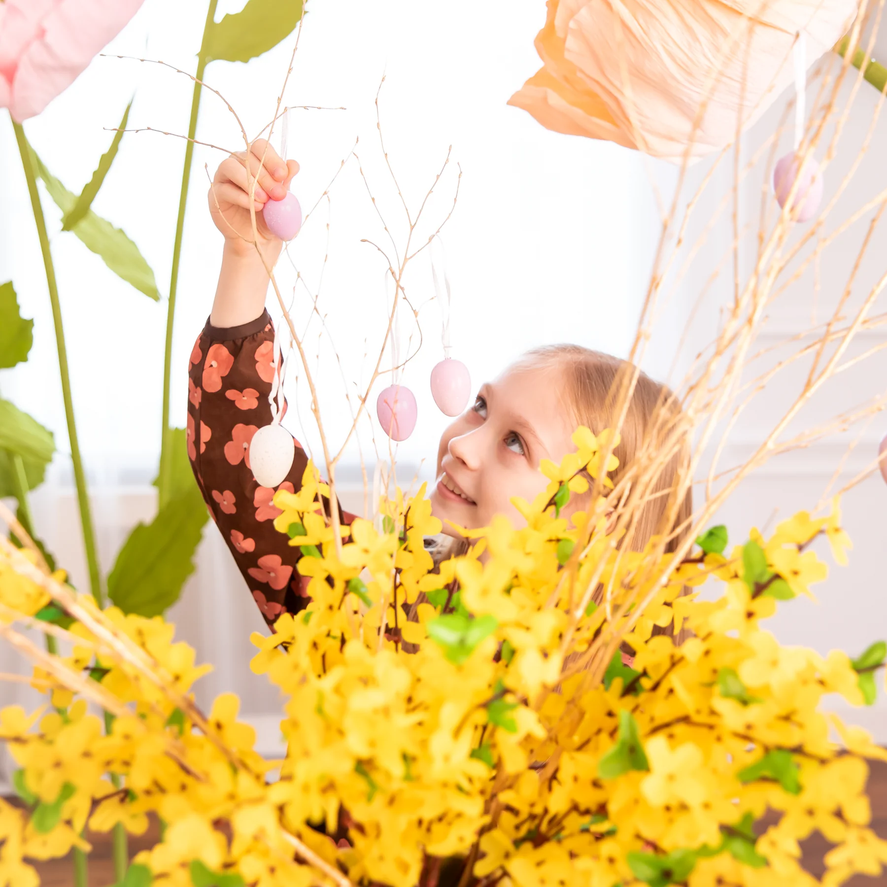 Voi ripustaa roikkumaan esim. pajunoksiin, koristemunissa valkoinen satiininauha.
