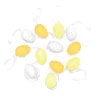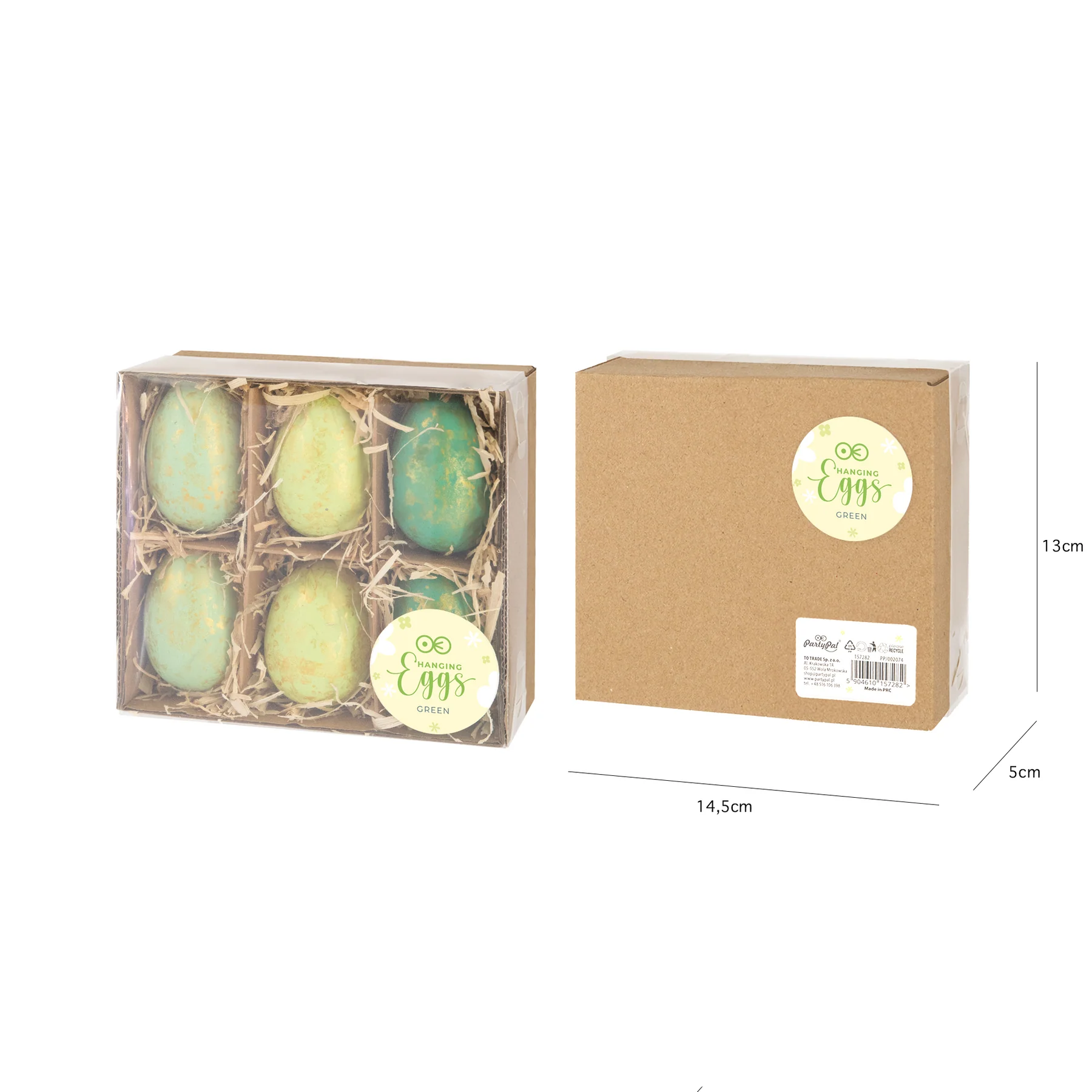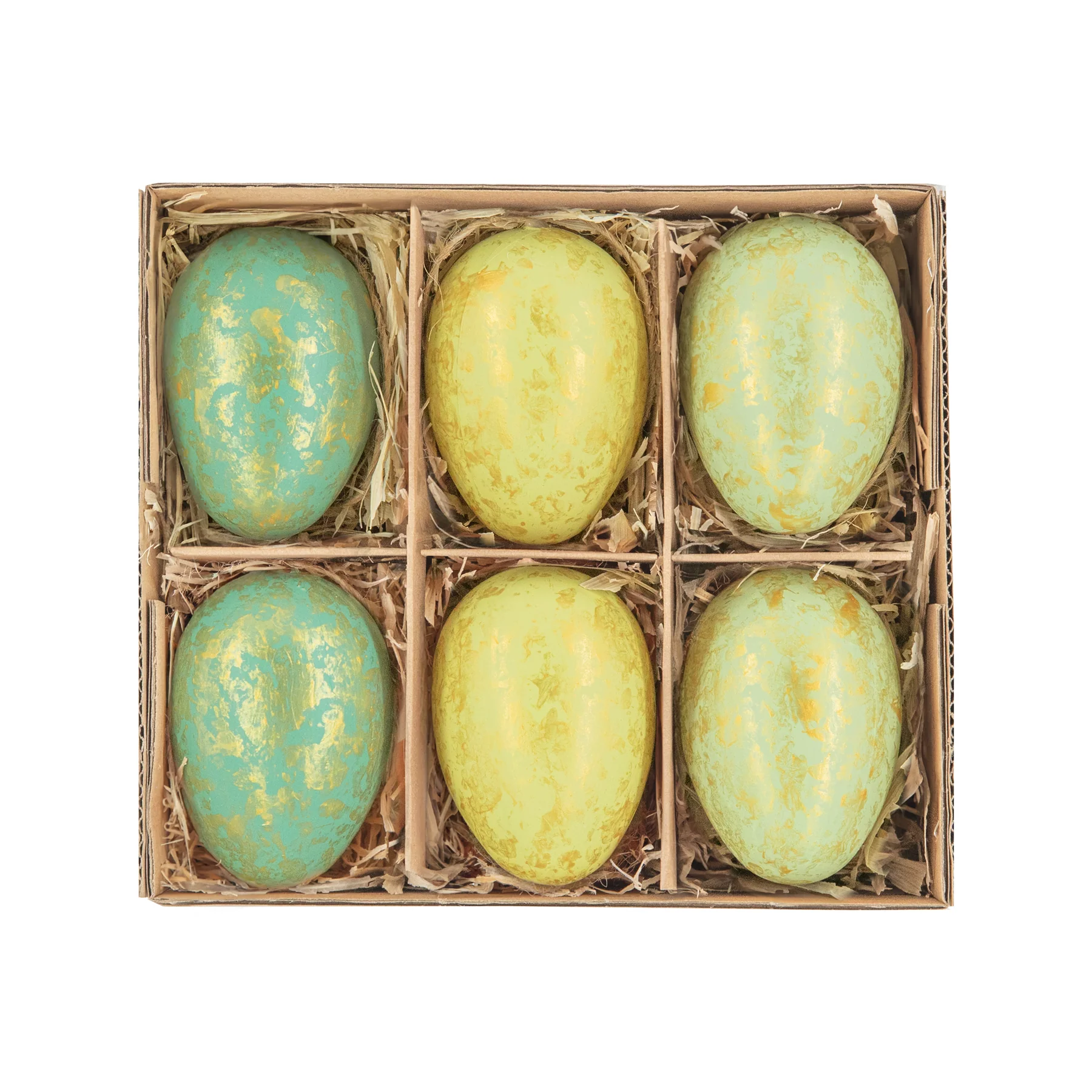 Pakkauksessa 6kpl värilajitelma muovisia koristemunia kultaisella koristelulla.