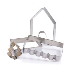 Scrapcooking Kit sisältää 5 ruostumattomasta teräksestä valmistettua keksileikkuria piparkakkutalon tekemiseen ja koristeluun keksistä.