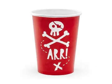 Pirates Party -paperimukit, punaiset ja valkoiset painatukset, tilavuus jopa 220 ml (7,4 oz). Juomakupeissa on 17 päivänä joulukuuta 2020 annetussa komission täytäntöönpanoasetuksessa (EU) 2020/2151 säännöistä direktiivin (EU) 2019/904 liitteessä olevassa D osassa lueteltujen kertakäyttöisten muovituotteiden yhdenmukaistettuja merkintäeritelmiä koskevista säännöistä vaadittu painettu merkintä. Euroopan parlamentti ja neuvosto tiettyjen muovituotteiden ympäristövaikutusten vähentämisestä