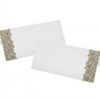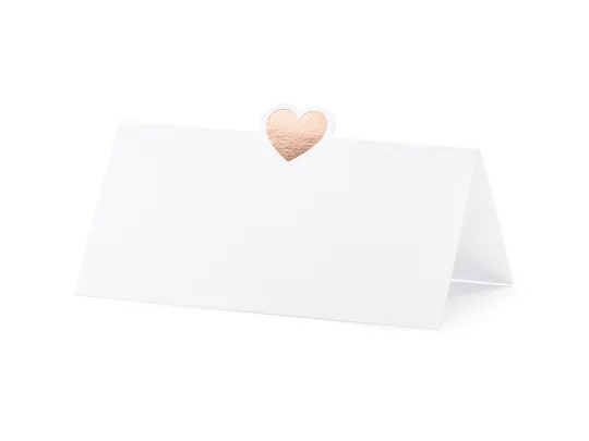 Valkoisesta paperista valmistetut paikkakortit ruusukultaisella metallisydämellä, koko koon jälkeen n. 10 x 5 cm.