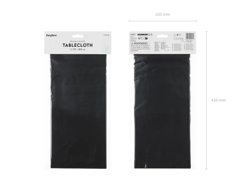 Musta pöytäliina, kostealla pyyhkimisen kestävää, synteettistä materiaalia. Koko n. 137x183cm