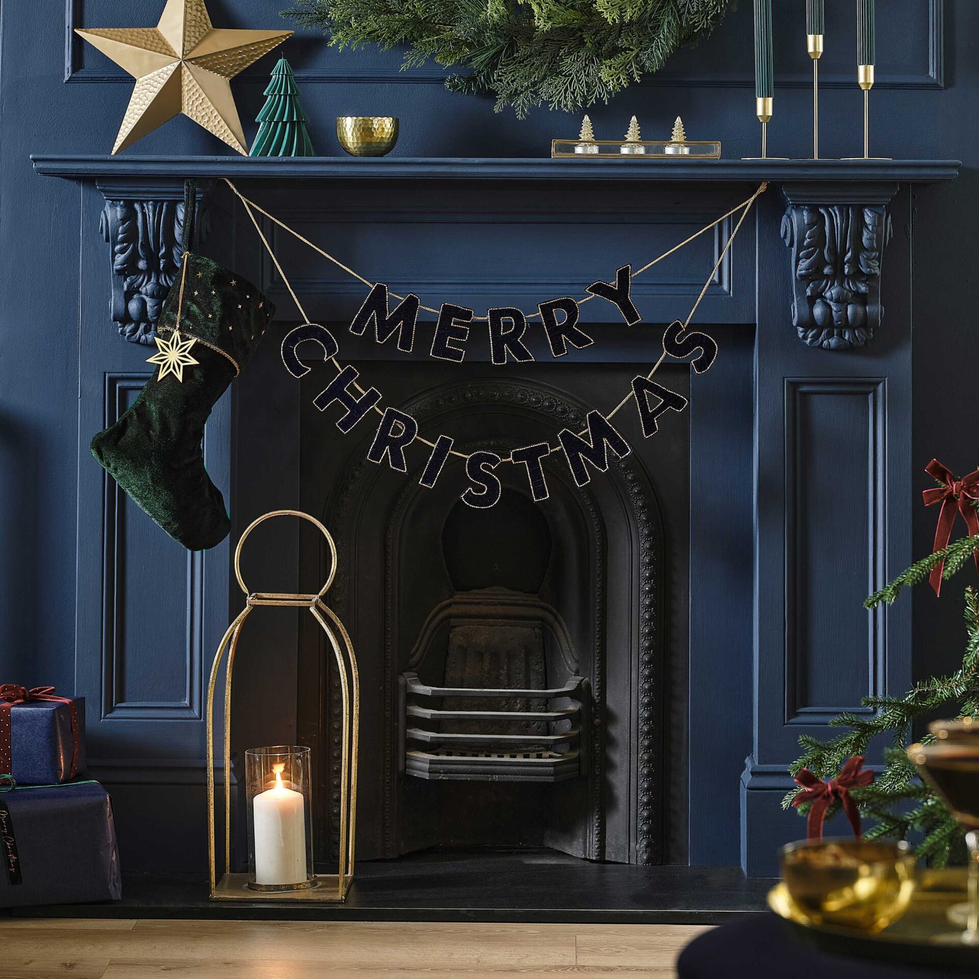 Sisältää 14 samettista kirjainta, jotka on reunakoristeltu kultaisin helmin ja 1,7m pitkän kultaisen nauhan.