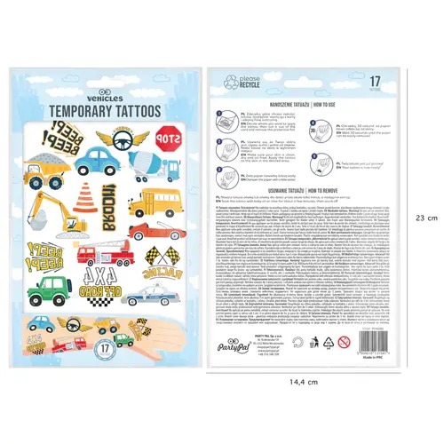 Setti sisältää 17 kpl pestäviä tatuointeja Kostuta vain tatuointi vedellä ja 30 sekunnin kuluttua se on valmis!
