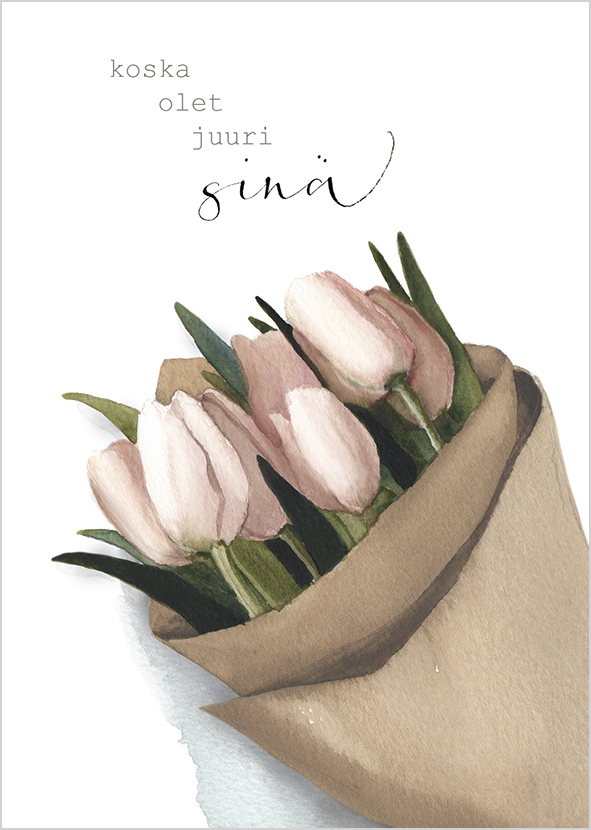 Kuvassa ruskeaan paperiin kääritty kimppu vaaleanpunaisia tulppaaneja ja sen yläpuolella teksti ”Koska olet juuri sinä”.