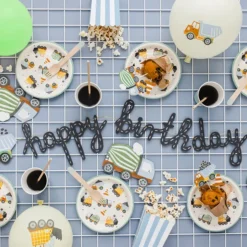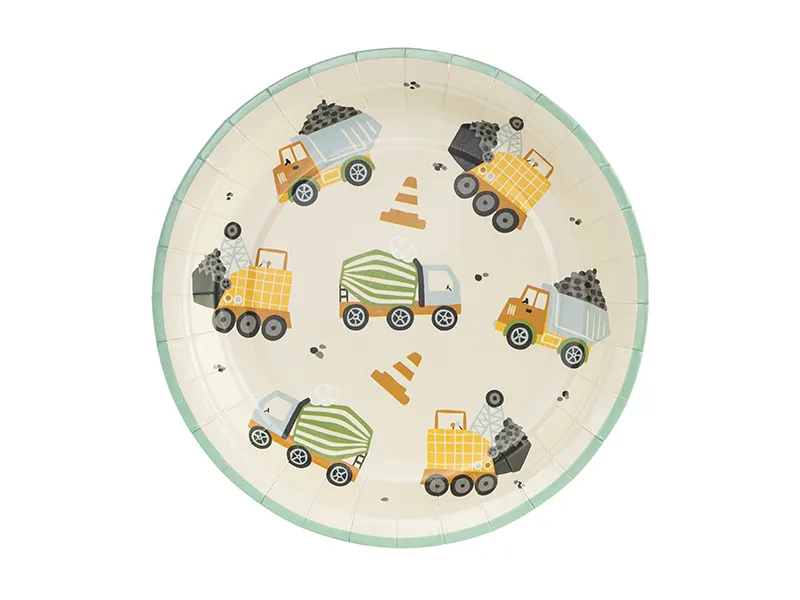 Piristä juhlapöytää näillä värikkäillä rakennusajoneuvoteemaisilla paperilautasilla! Hauska kuvitus ja kirkkaat värit tekevät niistä täydellisen valinnan lasten syntymäpäiväjuhliin ja teemapartypöytiin.